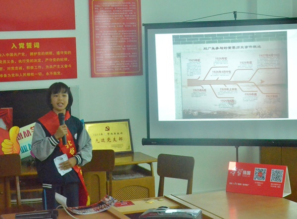 活动的第二项由红领巾宣讲员为大家分享中山县首任团委书记刘广生的故事。每一个宣讲员都声情并茂地分别向大家介绍了“择师运动”“卖蔗埔起义”“秋收暴动”。在宣讲过程中少先队员们深刻感受到今天的生活是先辈们用他们的智慧和心血创造的,要珍惜今天的幸福生活,好好学习,奋发图强。