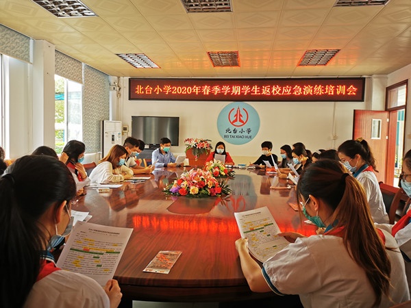 为保证演练活动的顺利进行,北台小学根据疫情防控和学校实际工作制定了《2020年春季学期开学前学校新冠肺炎疫情防控应急演练方案》,演练前召开培训会。