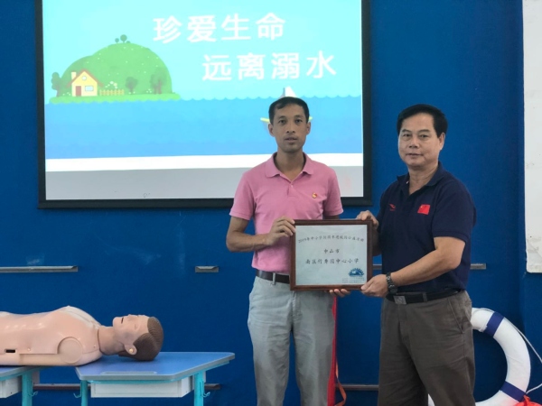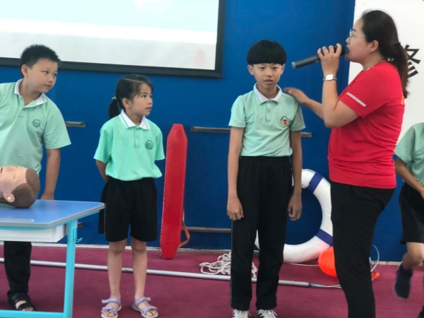 毕老师介绍了游泳应该注意的问题,遇到同伴落水意外情况如何施救,还传授给学生水中抽筋的自救方法,以及一套规范的心肺复苏基本方法。在座的全体学生听得仔细,记得认真,还积极参与知识竞答。进一步增强了师生的自救技能和本领,讲师还讲解了溺水的急救知识以及救生圈、救援绳等一些救援器材的使用方法,并告诫学生们,暑期到了不要在没有大人的监护下到深水区游泳玩耍以免发生溺水。