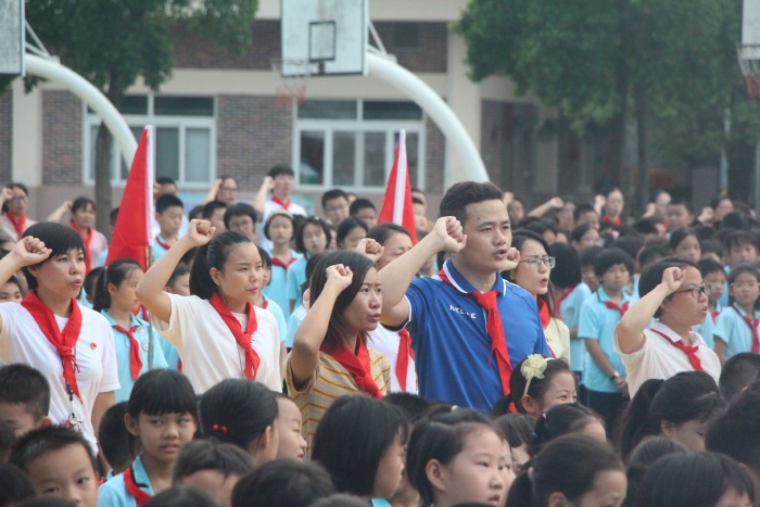 第三项,由大队辅导员李晓宇宙学长带领全体导师进行师德师风宣誓。在全体学生的见证下,老师们面向国旗,举起右手,进行庄严宣誓:“我是一名光荣的人民教师。面对国旗,我庄严宣誓:忠于人民的教育事业,履行教师的神圣职责。爱国守法、以德育人;爱岗敬业、关爱学生,刻苦钻研、严谨笃学;勇于创新、奋发进取;淡泊名利、志存高远;教书育人、为人师表;团结协作、终身学习。为学校教育事业的全面发展、为中华民族的伟大复兴、为人类文明的不断进步,贡献自己的全部智慧和力量!”