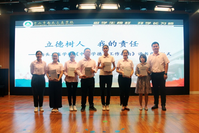 为了为深入贯彻落实立德树人根本任务,加强对中小学德育工作的指导,切实将党和国家关于中小学德育工作的要求落细落小落实,着力构建方向正确、内容完善、学段衔接、载体丰富、常态开展的德育工作体系,大力促进德育工作专业化、规范化、实效化,努力形成全员育人、全程育人、全方位育人的德育工作格局,近日,中山市南头三鑫学校举行了“立德树人,我的责任”为主题的《中小学德育工作指南》读书启动仪式,陈尔琪校长和邓旭副校长在台上为老师们颁发了德育书籍。