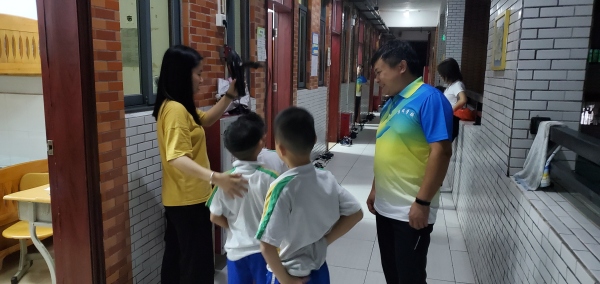 此次参与新生宿舍走访活动的还有南头华晖学校校长李明勇先生、副校长郑堪文先生、副校长庞天明先生以及学校一众行政领导、学校一二年级住宿班班主任和学校部分青年教师。进行宿舍走访活动前,由学校后勤助理岑守添老师对本次活动进行讲解和宿舍安全教育培训。进宿舍后,孩子们看见老师来了都显得非常兴奋,每个宿舍都开始热闹起来。有的老师在宿舍里倾听见天孩子们在学校里的趣事;有的在宿舍里指导孩子们如何更好地摆放个人物品;有的帮孩子们吹头发;孩子们甚是高兴。孩子们都在认真聆听老师们的教导,宿舍里传来阵阵温暖的笑声。