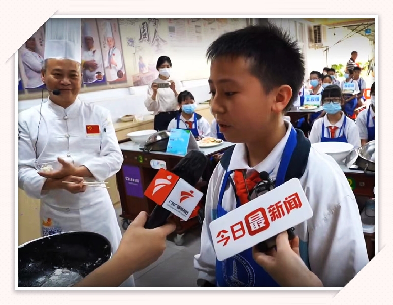 广东南方卫视5月8日晚8时,红旗中学劳动教育食育课程“姜撞奶”准时在节目《今日最新闻》播出,节目组希望开展“劳动教育 赋能成长”策划,介绍宣传部分市、县优秀特色劳动课程,呈现他们精彩的劳动教育成果。佛山市红旗中学作为活动首站,于2022年5月18日上午接受了节目组的直播和采访,厨师就是老师,灶台就是讲台,在全省甚至全国面前展示了我校的一节美食实训课堂“顺德姜撞奶”。课堂邀请了中国名厨孙永康先生对学生进行指导。