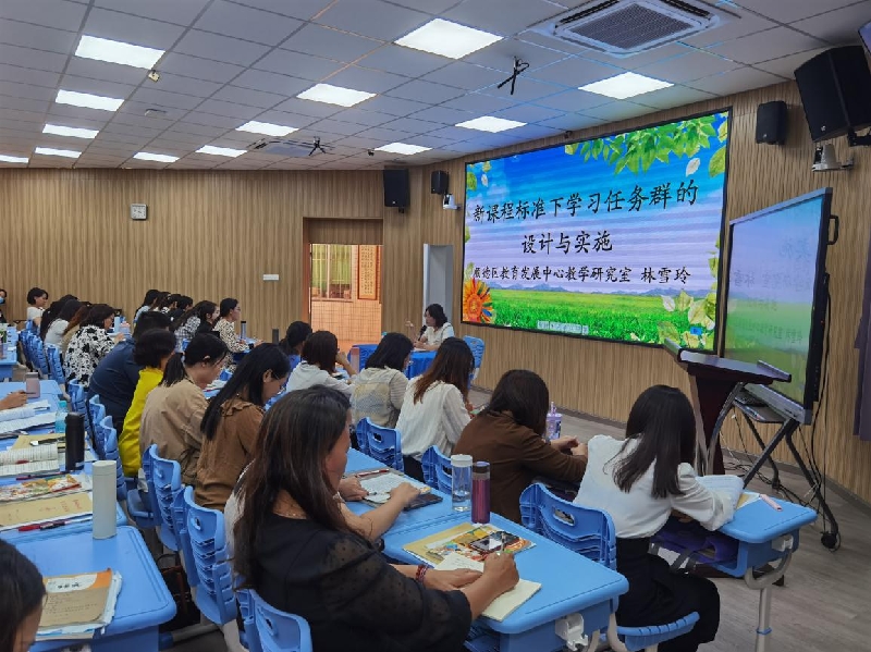 活动的第四个议程,由顺德区教育发展中心教研员林雪玲老师进行《新课程标准下的学习任务群的设计与实施》专题讲座。林老师首先大力点赞了龙江镇区域联合教研共同体的教研模式,并对三所学校提出希望,共同体各校应该拧成一股绳,加强资源互通,共同协作。