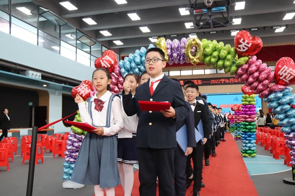 全体四年级孩子们齐唱《一起向未来》,大家在熟悉的旋律中畅想未来,放飞梦想。然后,在主持人的带领下庄严宣誓。高举的拳头代表心中的坚定,铿锵的誓言饱含对未来的决心。