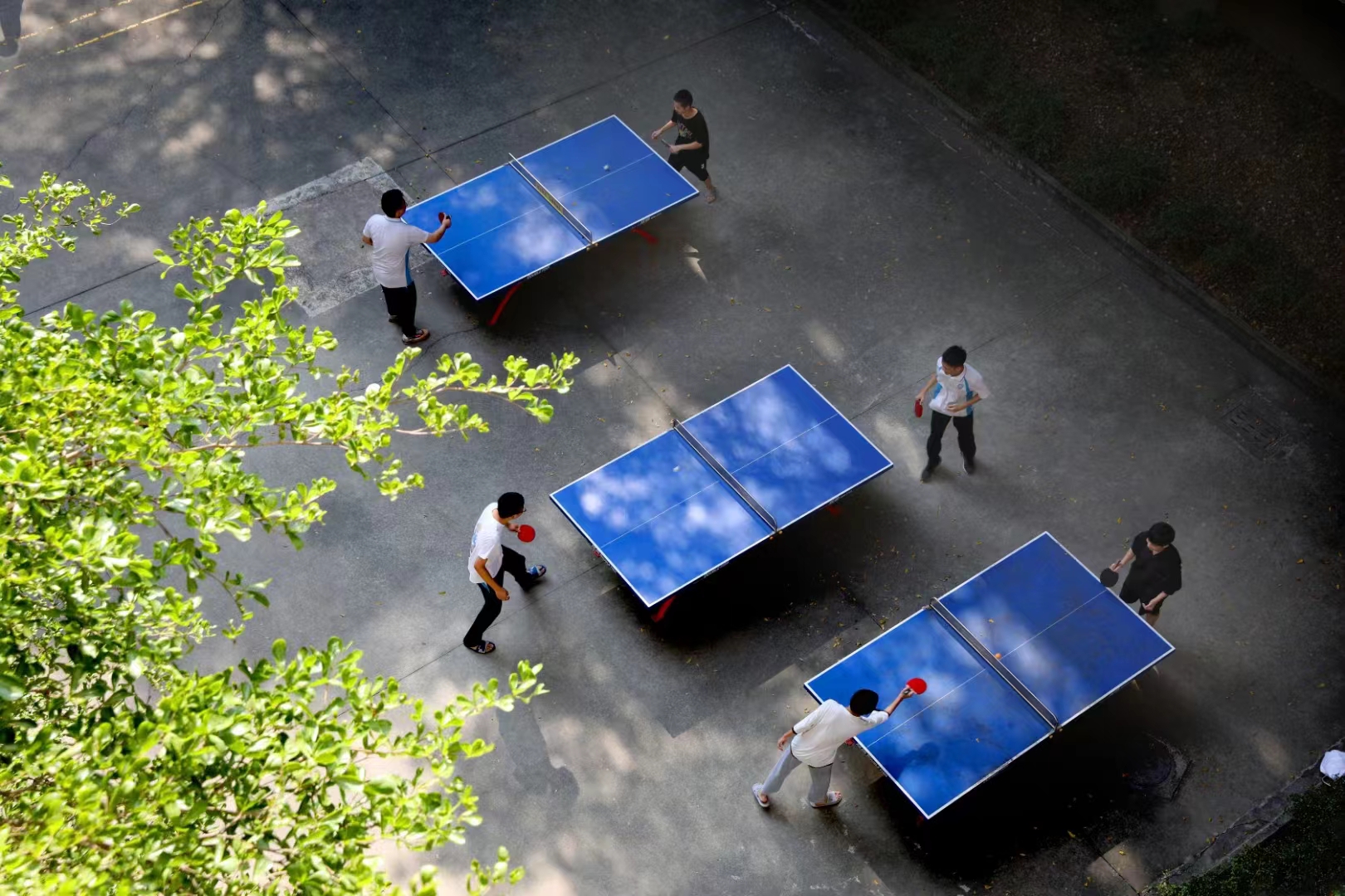 学生在树阴下打乒乓球