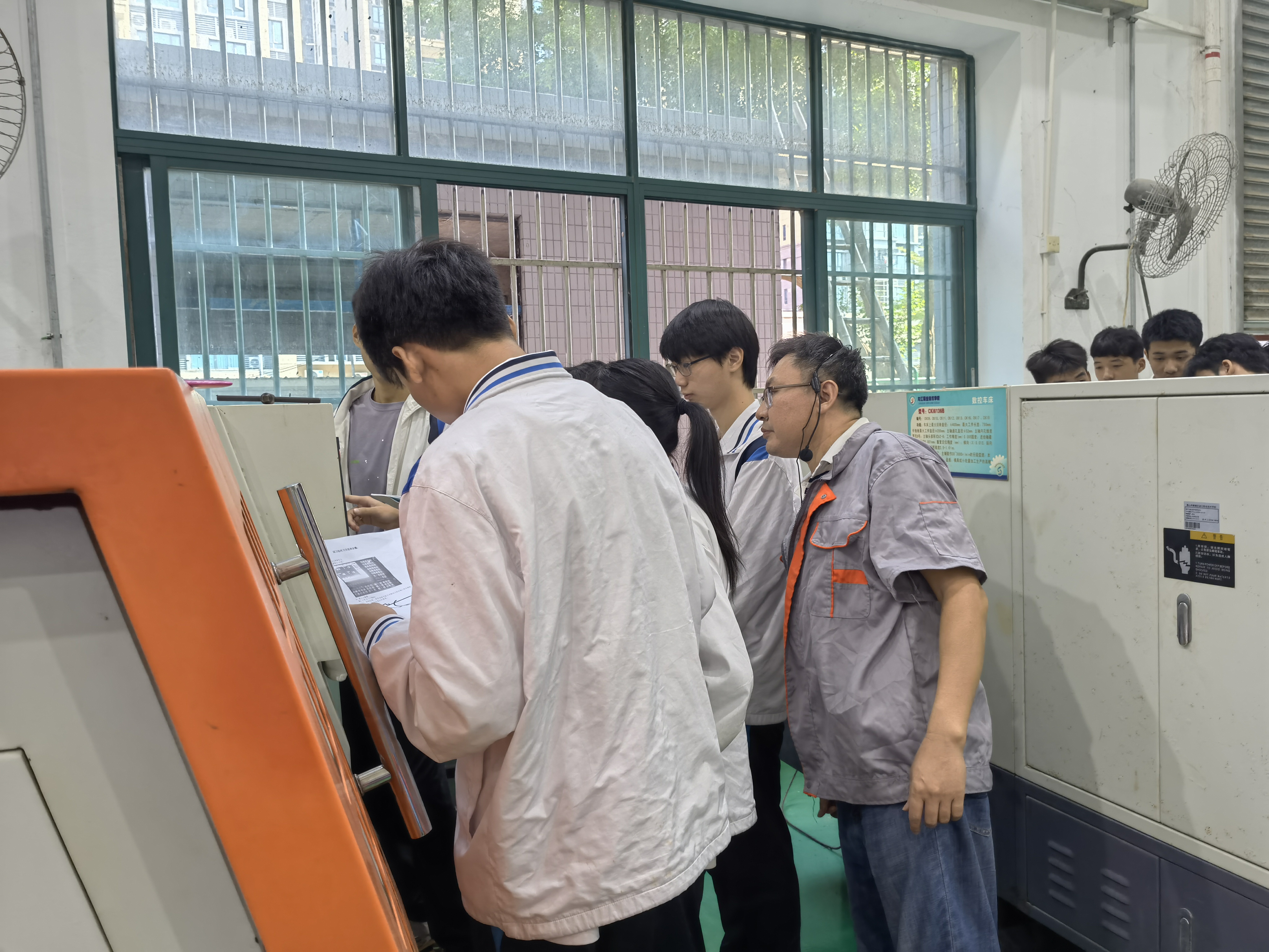 王老师指导学生操作数控车床