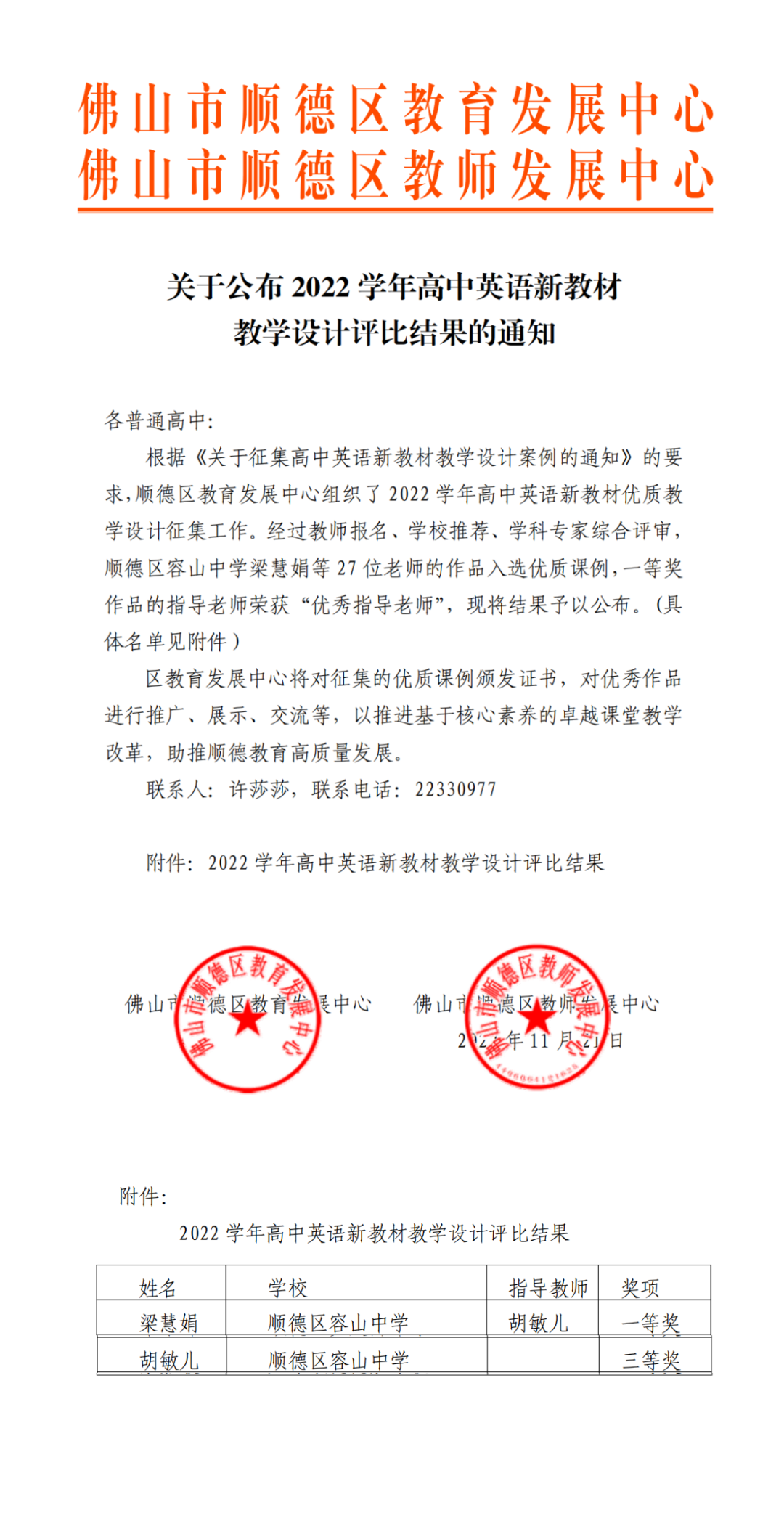 根据《关于征集高中英语新教材教学设计案例的通知》的要求,顺德区教育发展中心组织了2022学年高中英语新教材优质教学设计征集工作。近日,顺德区教育发展中心公布了2022学年高中英语新教材教学设计评比结果。我校英语科组梁慧娟老师的作品荣获本次评比一等奖第一名,该作品的指导老师胡敏儿获评“优秀指导老师”,同时胡敏儿老师的作品也获得本次评比活动的三等奖,她们的作品均入选顺德区优质课例。