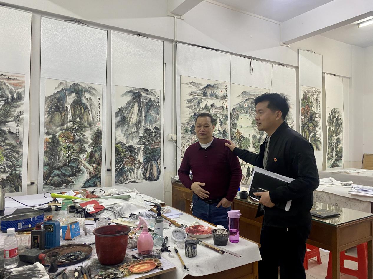 签约仪式后,双方召开了校地党建“共建”座谈会,叶书记参观了我校胡锡强老师国画工作室,胡老师对自行创作的乡土作品作了一一介绍。