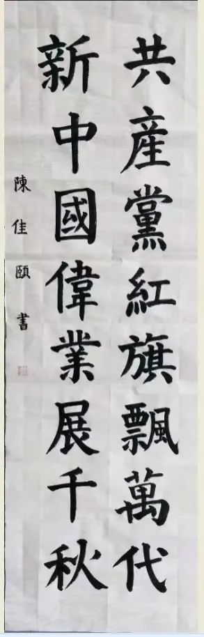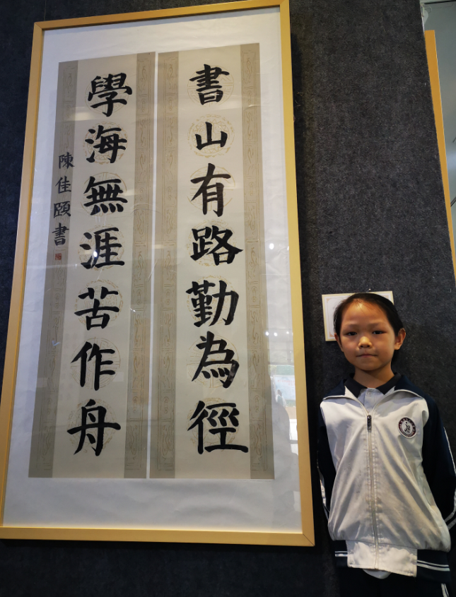 陈佳颐同学是红旗小学四年(4)班的学生,她学习成绩优秀,可绝不是“书呆子”。她是一位活泼可爱的小女孩,也是一位爱热闹、喜欢玩耍的小女生。但是,一说到书法练习,年纪小小的她可以马上收起那颗爱玩的心,认真投入练习。她勤学刻苦,挑战自我,在书法学练中取得了喜人的成果。