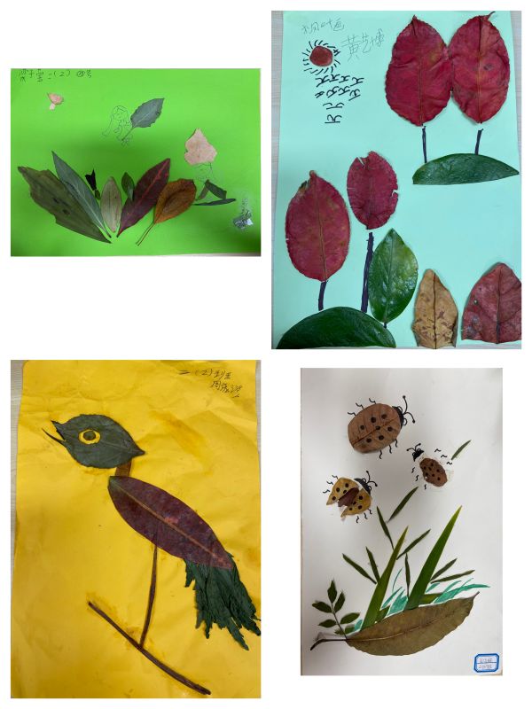 南方气候湿润温暖,树木四季常青。叶子秋天不会像北方的叶子那样全部枯黄落掉,可是到了春天以后,新叶小芽长出来,旧叶子自然掉落,所以广东的春天就有了落叶的景象。孩子们到户外收集了千姿百态、色彩斑斓的树叶,通过剪、贴、拼、染色等多种手工制作方式,用一双双巧手赋予树叶第二次生命,把这些多姿多彩的树叶粘贴成了一幅幅别具韵味的手工作品。