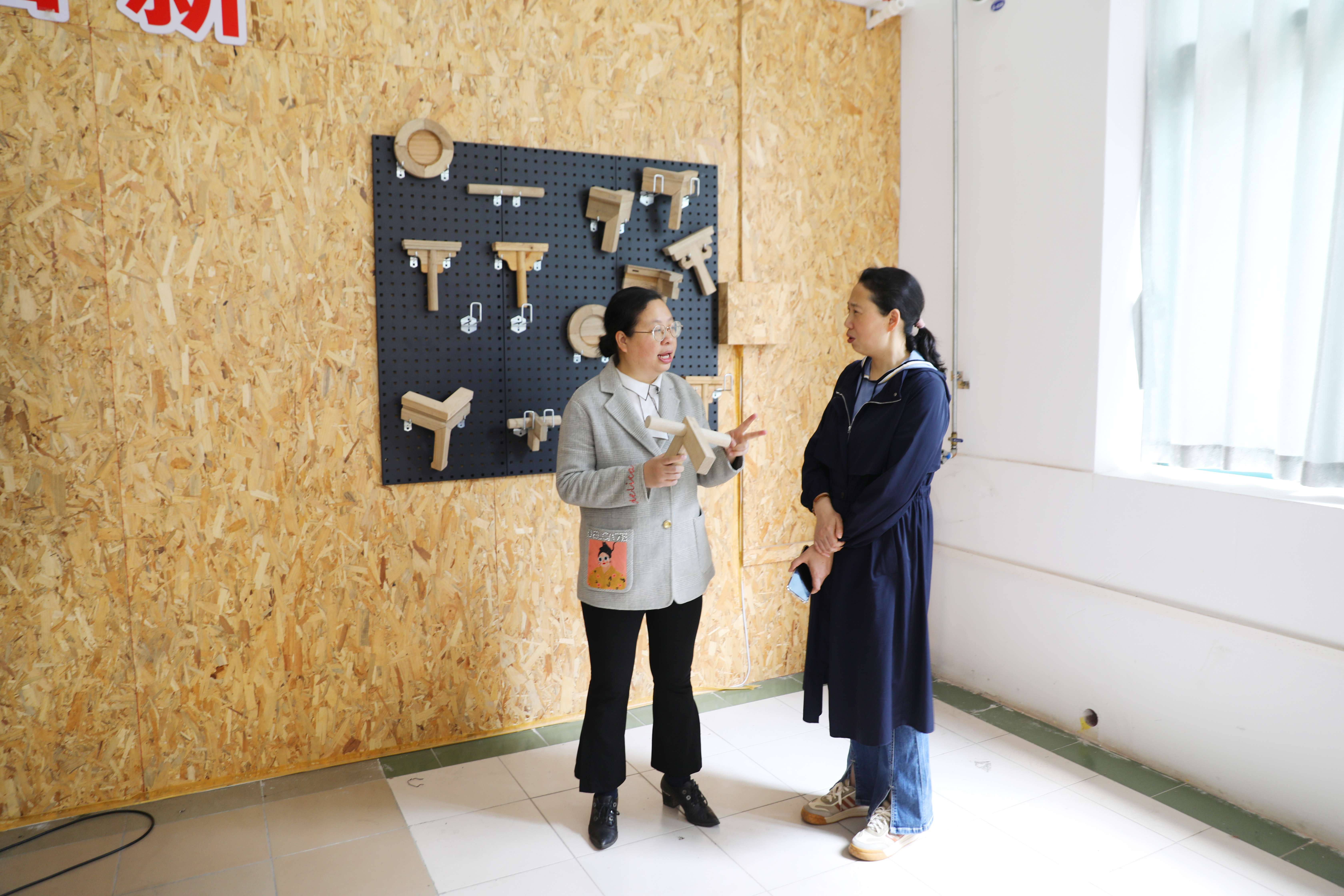 杨副校长向林副书记讲解家具中的榫卯结构