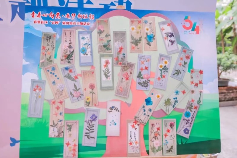 第四项:趣味手作。团员们闻着花香、精心构图,在空白书签上摆放干花与树叶进行造型设计和粘贴制作,并在书签上写下祝福语,大家相互交流,经过创作,朵朵干花、片片绿叶在书签上展现独特风彩,“学习新思想、争做新青年”、“把春日揽入怀中,点上青春的颜色”......