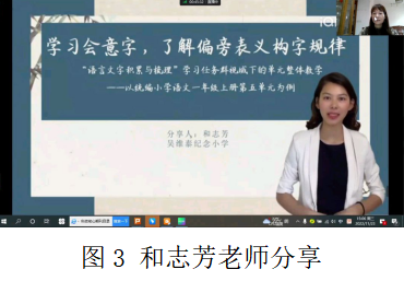 吴维泰纪念小学另外一位教师代表和志芳老师则以统编小学一年级上册第五单元为例分享“语言文字积累与梳理”学习任务群视域下单元整体教学。和老师的教学设计在贴合生学生活的情境中,围绕“争当汉字小达人”这一主题,通过多种形式的识字任务,带领学生识字积累、整理,逐步完成分解目标,最终达成核心目标。让学生享受识字的乐趣,感受汉字的魅力,初识“积累”与“梳理”的奥秘。