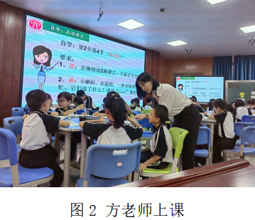 方老师践行“246课堂教学模式”:“二心”:素养为核心,学为中心;“四为”:以问题为先导,以活动为特征,以思维为主线,以实践运用为保证;“六学”:导学、自学、互学、展学、结学、迁学。各项学习活动环环相扣,体现了新课程标准下的优良课堂生态,让师生沉浸在愉快的学习中。
