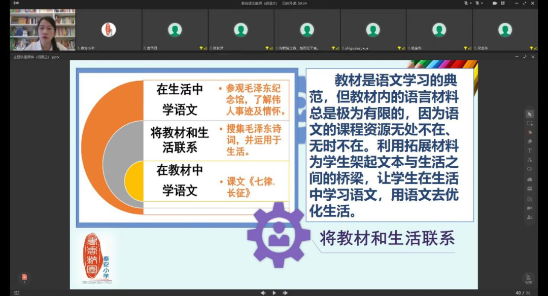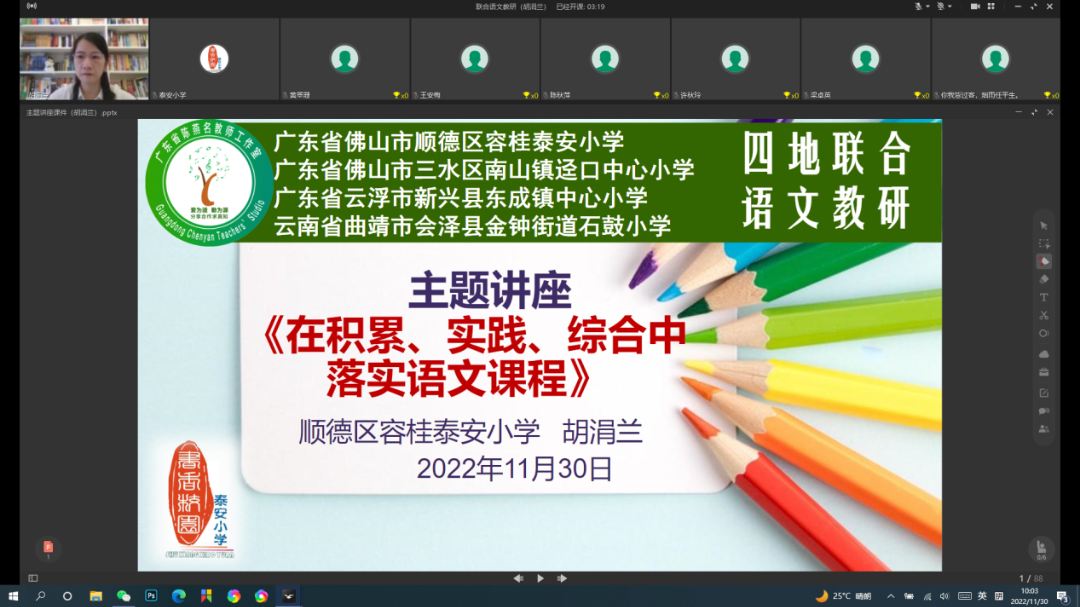 异地共同线上教研,区域间的教育扶贫,一直是国家的教育方针与教育举措,能让更多的人享受优质的教育资源。为促进教学科研能力的提升,落实新课标理念,加强顺德、三水、云浮、云南四地的教学交流,11月30日上午,虽然已是寒天催日短,风浪与云平的冬日时节,佛山市顺德区容桂泰安小学开展与云南省曲靖市会泽县金钟街道石鼓小学、云浮市新兴县东成镇中心小学、佛山市三水区南山镇泾口中心小学的四地联合线上语文教研活动。 主持此次联合教研活动的是佛山市优秀学科青年教师胡涓兰老师,为保障教研内容的实用性、科学性、推广性,胡涓兰老师利用可视化技术,为四地学校搭建了一个跨区域的交流研讨平台,进行了既有理论高度,又有实操例证的主题讲座《在积累、实践、综合中落实语文课程》。在两个小时的讲座和交流中,胡涓兰老师结合了作文教学、阅读教学以及在落实新课程理念中,需要提别注意语言的积累和梳理、语言的实用性和思辨性、整本书阅读和跨学科学习、单元任务群组织与呈现,穿插了学生辩证思维能力的提升、思维导图工具的教学使用等。 先进的教学理念及实践操作经验得到与会老师的高度评价,达到了区域联合教研的目的。 他们纷纷表示:胡老师的讲座“既有理论的高度”,又有“接地气的实践指导作用”,体现了胡老师扎实的专业素养及对教育的专注和热情,体现了泰安小学浓厚的教育科研氛围及专业引领作用。期待这种高效、实用的示范性联合教研形式能得到更多的推广和普及,使更多的教师在教育科研方面得到切实提升!