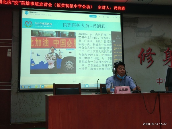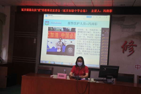 5月14日下午,板芙中学举办了一场特殊的“共克时艰情系母校”湖北抗疫英雄事迹宣讲会。该镇医院援鄂护士冯润彩来到自己中学母校为全校教职工讲述“抗疫之路”。学校全体教师现场聆听了冯润彩讲述援鄂抗疫故事,同时,全体学生利用钉钉群在课室观看直播。