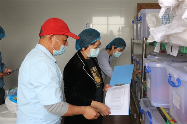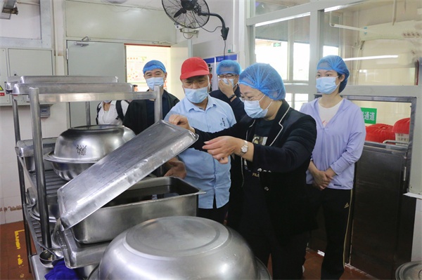 周丽端委员一行先来到学校食堂,对食堂的各个功能区域细致查看,并就食堂清洁消毒、食材采购、加工操作要求及流程,对食堂员工进行现场问询。随后,周丽端委员一行听取了食堂负责人和学校关于食品安全工作的汇报,同时查阅了相关台账资料。