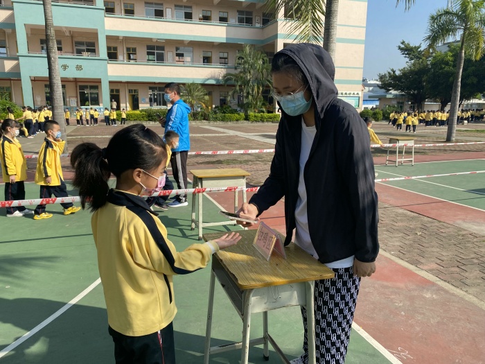 同学们带好自己的二维码,拍好整整齐齐的队伍,有条不紊、按要求进入监测分区,他们佩戴好口罩,保持好间距,安安静静,依次通过检测口,显得纪律严明,训练有素。