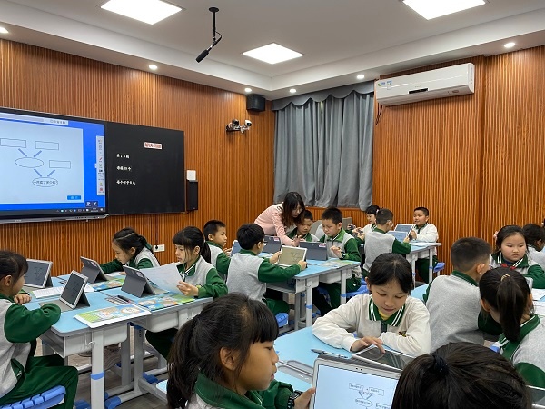 作为东道主,湖洲小学向东山镇中心小学团队展示了两节风格各异的课例。湖洲小学的林秋池老师执教《快乐读书吧》一课。林老师从《西游记》着手,通过看回目猜故事、结合语文园地“交流平台”中阅读古典名著猜读、图表式等方法,激发学生兴趣,引导学生制定阅读计划,实现课内与课外阅读衔接。湖洲小学的陈晓虹老师执教《用连乘解决问题》一课。陈老师利用前置探究单分析学情,明确教学生长点,以义卖活动卖水杯为切入点,通过智慧平板让学生独立构建树状图,引导学生分析多个条件之间的联系,将多媒体技术有效运用于课堂教学。