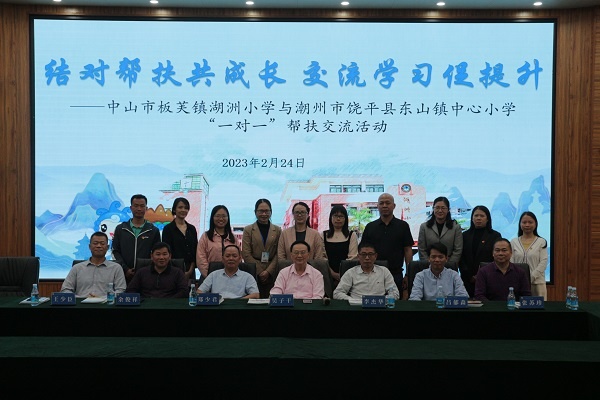 2月24日,中山市板芙镇湖洲小学与潮州市饶平县东山镇中心小学开展了“一对一”帮扶交流活动。原中山市督学吴子干校长,饶平县东山镇中心小学余俊祥校长、王少臣副校长、吕郁森副校长、张苏珍教研员,板芙镇教育和体育事务中心李杰华副主任、蒋凤梅老师,湖洲小学郑少君校长,湖洲小学全体行政、工会主席、学部部长、学科组长及骨干教师等参加了本次活动。