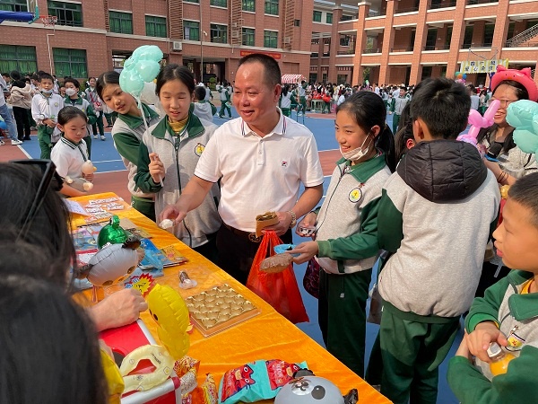 本次爱心义卖活动以各班为单位,率先义卖“沉沉”“灵灵”文创周边产品,印有“沉沉”“灵灵”图案的笔记本、钥匙扣、铅笔、橡皮、尺子等深受学生喜爱。孩子们来到户外义卖现场,琳琅满目、别具一格的义卖新品,让人眼前一亮;卖力吆喝的“售货员”,成功向师生们售出义卖品;精彩绝伦的乐队表演吸粉无数,现场掌声不断。