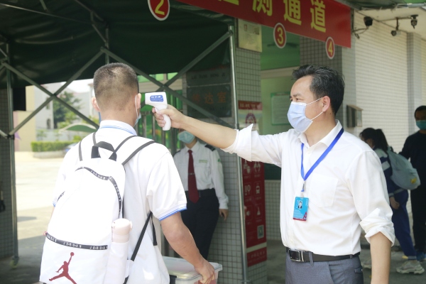 根据上级指引,博爱中学初三学生从中午12:20开始,实行分五批次错峰返校。中午12:20,值日教师组织学生在校门口排队,保持1米的间隔距离,依次有序进入体温检测通道。在测温区,值日教师在通道两侧通过红外测温仪和手持测温仪对学生逐个进行体温检测,体温正常的学生使用免洗洗手液清洁手部后进入校园。学生进校后按照指定路线回到相应班级。由班主任再次测量体温,方可进入课室。