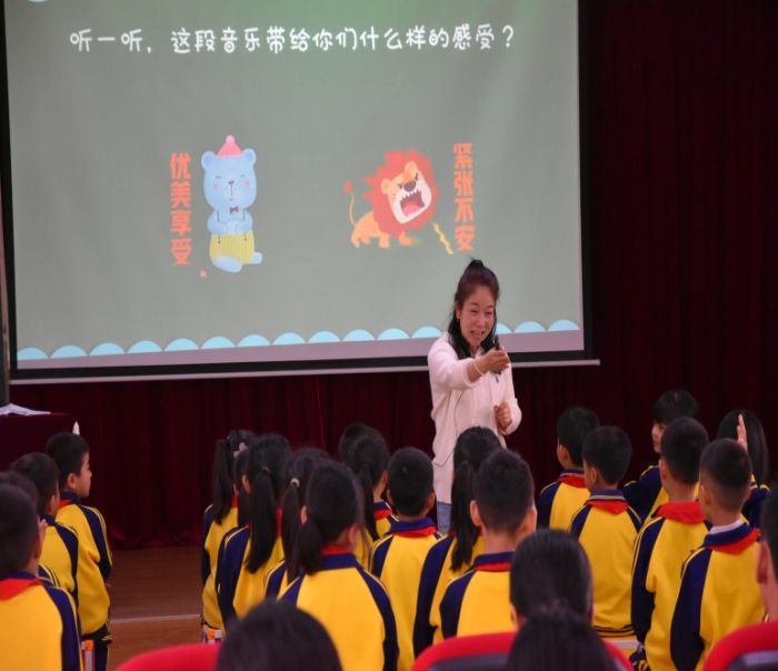 陈黎老师执教的是二年级下册第四课《狮王进行曲》。陈老师以新课标倡导的“以学生为主,以音乐为本”教学理念,综合运用情景激趣法、律动参与法、角色演绎法等教学模式,引导学生积极参与各项音乐活动,培养学生自主实践能力,进一步提升学生的音乐素养。课堂中,陈老师以音乐欣赏和音乐表现为主要内容,以趣味唱游和情境表演为课堂主线,在激发学生学习兴趣的同时,着力于节奏、力度、音色听辨、旋律听辨、乐曲结构、小乐器合奏等核心素养的提升训练。课堂生动活泼,趣味性强,学生在音乐活动中学得扎实,玩得开心。