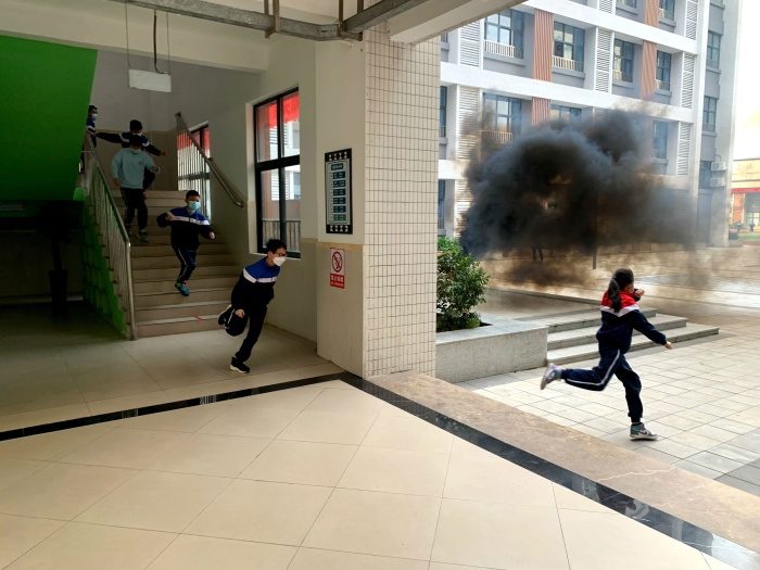 演练开始,火警的警报声响彻校园。各班班主任带领学生捂住口鼻,弯腰撤离;各楼层指导教师协助安抚稳定学生情绪,指导帮助学生做出正确逃生姿势,沿着学校就近楼梯口逃生,有序地到达操场安全地带;随即体育委员开始清点人数并上报至现场年级组长,确保全部学生安全到达。