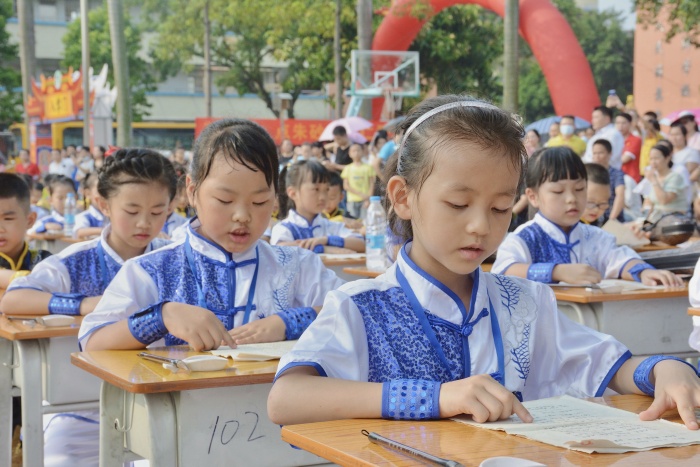 本次“开笔礼”按照“入场”、“整装习礼”、“孝亲敬师”、“朱砂启智”、“击鼓鸣志”、“启蒙描红”、“礼成退场”等环节为同学们开笔启蒙。