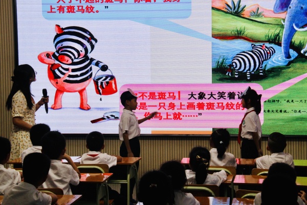 活动第一部分由卢雪飞老师和陈婕妤老师带来了两节精彩纷呈的课例。卢雪飞老师执教绘本《小猪变形记》,以亲切的语言,耐心的引导,在图画“冲击”中激发学生阅读的兴趣,指导学生仿照绘本想象小猪和袋鼠的对话。说练的结合,使整个堂课做到了活、趣、实,从而帮助学生打开写话的大门。陈婕妤老师执教习作《变形记》,教学中陈老师既有对学生写作方法的归纳与提炼——从变形后的事物视角看世界、用修辞把特定遭遇写清楚、赋予变形对象人的感受;又有学生喜闻乐见的情境说写指导和妙趣横生的范例分析、引导,使学生说得有趣,写得精彩。