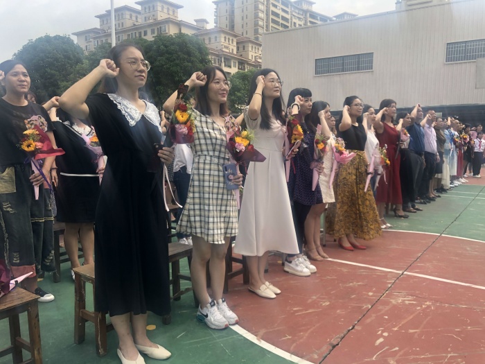 上午8:30,活动在庄严的升旗仪式中拉开帷幕。林伟光校长在学生的欢呼雀跃声中带领全校90多位教师走过红地毯入场就座。首先,小沥小学古筝社团和合唱队奏唱《听我说谢谢你》,他们用琴声、歌声和手语表达对老师的敬爱之情。随后,小沥小学少先队员代表为全体教师送上了一束鲜花,五年级的少先队员给老师们带来《教师诵》。紧接着,小沥小学全体教师在黎三妹副校长的带领下宣誓,向全体学生和全社会做出庄严的承诺:立德树人奋进担当,教育脱贫托举希望!最后,林伟光校长和五(1)班家长代表为30多年如一日尽职尽责、爱生如子的高淑英老师送上“守正育德”的牌匾,表示对她最衷心的感谢和最诚挚的祝愿。