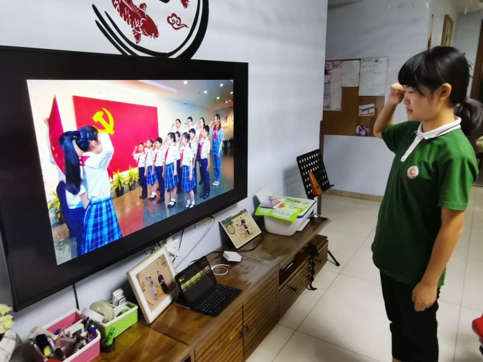 第三部分为队员们在家参加全国少工委举行的“从小学先锋,长大做先锋”主题网络直播活动。通过升国旗、唱国歌、主题队会等形式,激发爱国热情。