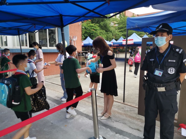 “同学们,请间隔一米以上距离,有序进校……”早晨7时许,朗晴小学大门口,同学们背着书包、戴着口罩,经测温显示正常后陆续进入校园。值日教师、保安、家长志愿者、辅警、民警等在校门口精心维持秩序,为学生保驾护航。学校精心布置体温检测通道,希望学生从入校门开始,就充满“回家”的感觉,帮助学生增强从线上到线下的适应力。