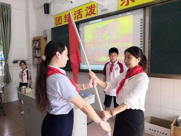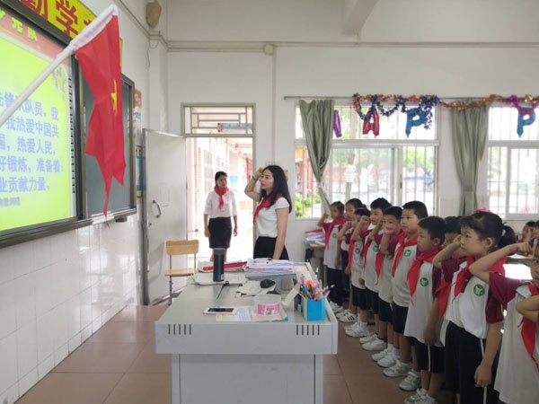在动听的队歌声中,简单而庄严的入队仪式开始了,新队员们昂首挺胸,敬队礼,唱队歌,在队旗下庄严宣誓……。虽然时值疫情期间,没有隆重的集会,但满满的仪式感一点也不能少,领巾飘,心向党。通过此次活动,壮大了少先队的队伍,每位队员都懂得了自己所肩负的光荣使命,他们定会牢记党的教诲,全面发展,做一名优秀的新时代好少年!