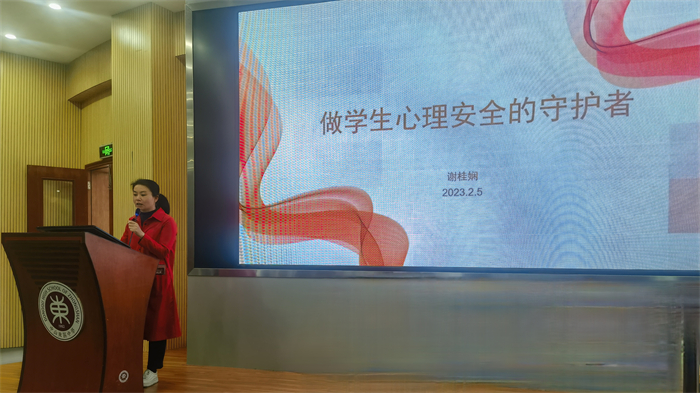谢桂娴老师就本学期心理工作进行了分享,她倡议班主任老师们要做好学生的守护者,保持对学生的密切关注,给予他们心理上和学业上的关怀,建立良好的家校关系、师生关系。