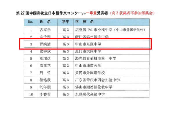 近日,由中国青少年研究中心和日本青少年研究所共同举办的第27届全国高中生日语作文竞赛获奖名单揭晓。我校高三7班罗婉清同学在全国106所学校的368名参赛选手中脱颖而出,荣获全国一等奖;张赛珍老师荣获优秀指导教师奖。