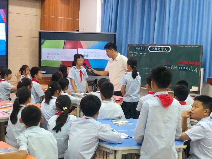 第二节李建主任执教五年级的《分数的再认识》,李主任从“数数”引入计数单位,同时通过具体情境,让学生对1的认知从自然数1拓展到单位“1”,进一步构建关于“率”的分数的认识,并且对“量”和“率”两者进行辨析,形成完整的分数认识。整堂课沉稳幽默,听课老师赞不绝口。
