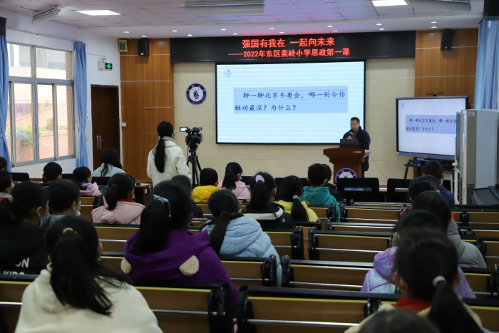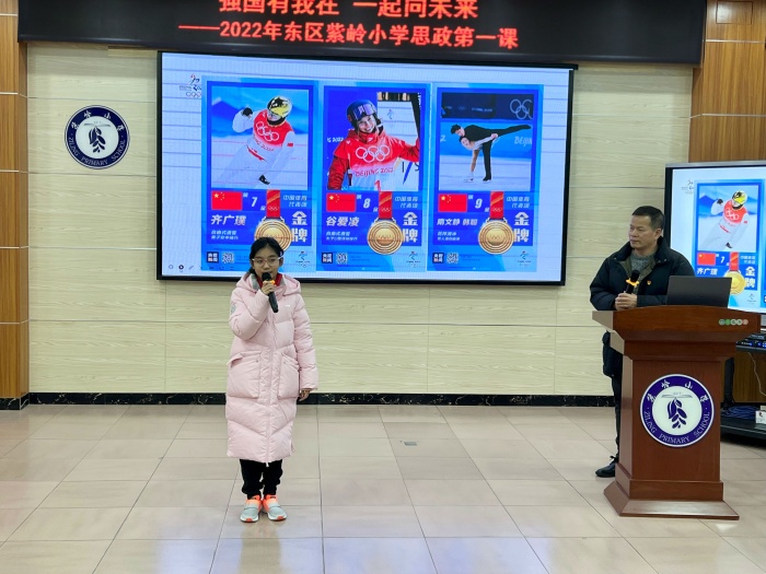何书记以“强国有我在 一起向未来”为主题,用生动的语言和激昂的情感,分享了苏翊鸣、谷爱凌等奥运健儿顽强拼搏、为国争光的故事。何书记说,赛场上高光时刻的背后是运动员们日复一日的努力和拼搏,胜利与失败是并存的,但是运动健儿从不言败,不断超越自我,不断突破极限,他们身上体现的奥林匹克精神,给大家带来激励的力量。紫小学子纷纷表示何书记的“思政第一课”精彩纷呈,争先恐后地在课堂上主动分享了自己对冬奥会的感受。雷悦然同学说:“我对北京冬奥会中的首金印象最深,中国短道速滑的队员们团结协作、奋勇向前、分秒必争,不到最后一刻都不放弃,最后以零点几秒的优势冲过终点,赢得了比赛。那一刻我被他们的精神所感动。”王煜均同学则分享了谷爱凌在大跳台中的比赛场面,谷爱凌在前两跳与第一名有差距时,勇于挑战自己,在第三跳向最高难度挑战,这种突破极限的体育精神让我印象深刻。