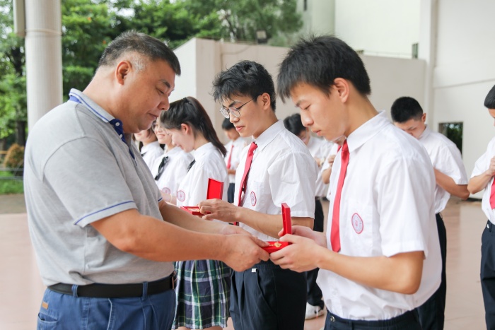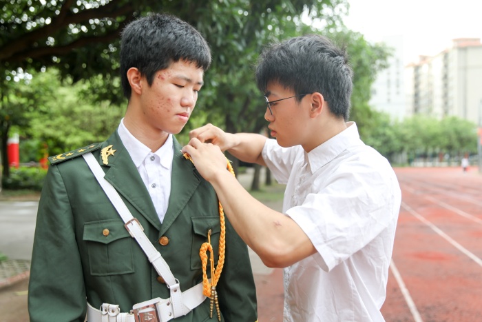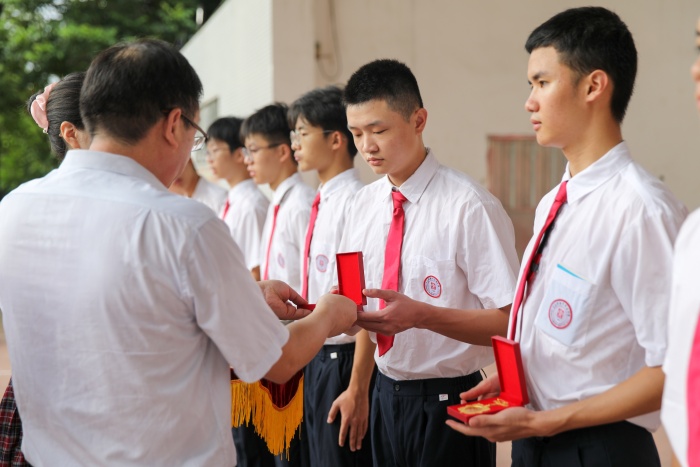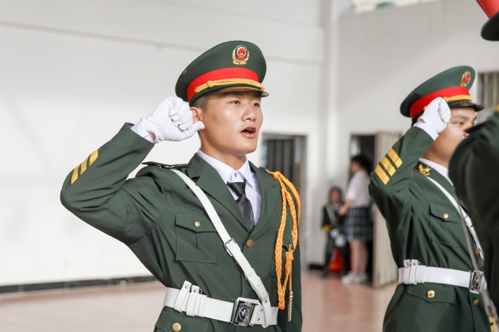 接着,周锦泉校长、王宏副校长,张旭副校长为2020级国旗班全体成员颁发纪念勋章。纪念勋章虽小,但却凝聚了2020级国旗班队员的爱国主义精神、吃苦耐劳精神和乐于奉献的精神。