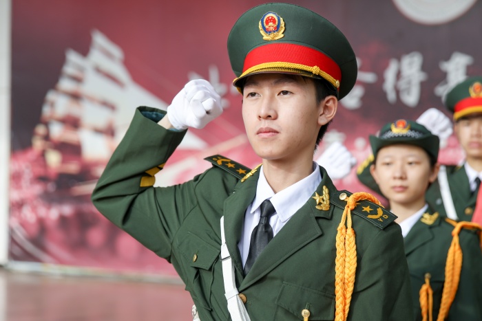 交接仪式的最后,是新一届国旗班成员进行宣誓。他们用坚定的神情与铿锵的话语,呼出了他们的承诺:接受爱国主义教育,增强爱国主义情,热爱祖国,热爱人民,热爱中国共产党,继承和发扬国旗班精神,自觉遵守国旗班章程,坚决完成国旗班的各项任务,做捍卫国旗的钢铁战士!
