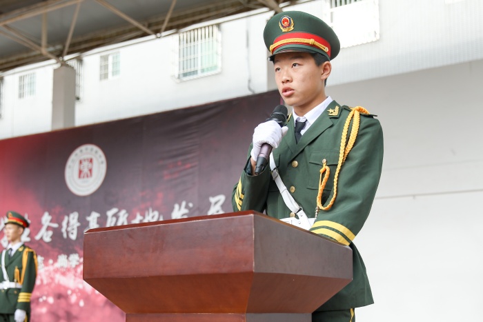 随后,2020级国旗班队长包琰腾同学发言。他说,国旗是国家的象征,每一个国旗班成员都承载着国家的荣耀。为了升好每一次旗,2020队员经历了长期的磨练,并保证:一定会做到退队不退色,把国旗班的精神发扬光大,绝不忘记自己作为国旗班成员的责任与使命,好好珍惜在这个集体里凝结的宝贵财富,在今后的学习和生活中更加努力。希望新国旗班以后每一次升旗都不断超越,守护这份荣耀。