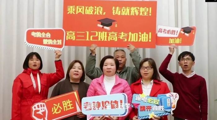 为了给即将参加高考的孩子们打气加油,老师们和家长们悄悄录好了视频,用最直观最激烈的方式给同学们呐喊、助威,声声加油,殷殷祝福、幕幕传情。视频中“成熟”的声音、“稚嫩”的演技让全场振奋,一时间掌声、欢呼声一浪盖过一浪。