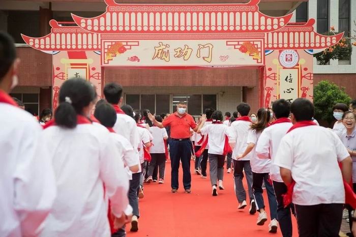 下午两点四十分,高三学子整肃在学校广场,分班依次穿过“成人门”,走上红地毯。全体高三老师列队两侧,双手为刚刚跨过成人门槛的学子们披上红色围巾,欢送他们穿越“成功门”,登上“十八岁成人礼暨高考动员大会”的主会场。