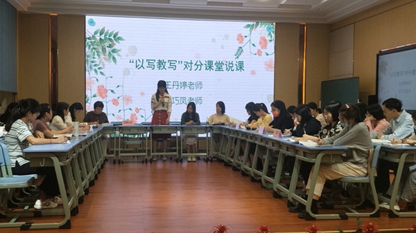 接着,参会老师共聚一堂,对小学习作教学进行互动交流。互动交流从上课老师进行说课开始,两位老师结合对分课堂教学的特点,阐述了她们两节课的教学思路,目标达成。接着,各学校代表以及与会老师分别就这两节课纷纷发表了自己的看法,大家畅所欲言,点亮着一个个耀眼的知识火花。