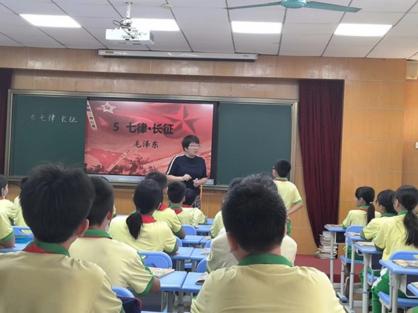 首先是课例展示,语文科组分低中高三个年级科组分别进行课例展示。低年级组由梁萍老师进行《树之歌》的授课。在教学过程中,梁萍老师通过创设情境,加上精美的插图,让学生自主探究、自主识字。梁萍老师通过形式多样的读、游戏、练习,使课堂气氛活跃,学生积极投入,走进文本,提炼文中的知识,充分发挥学生学习的主体性。中年级科组则是由肖晓娟老师展示了课例《一个豆荚里的五粒豆》,文章通过丰富的想象,幻想和夸张的手法,充分表现了童话的特点。肖老师带领同学们从图片欣赏导入入手,让学生了解安徒生童话的精彩之处,引入童话故事的学习,接着在学生充分预习的基础上,让学生抓住文章的重点部分进行学习理解故事内容,在学习过程中,不仅理解了课文,还突破了课文教学的重难点,老师润物无声,学生滋润有露。高年级组则是王颖芳主任执教的课例《七律·长征》,让六(4)班的孩子和听课的老师深深地体会到革命的艰辛和红军的英雄气概。王老师这一课目标清晰,内容丰富,语言精炼。她不仅善于把控课堂,落实教学目标,而且注重启发引导,激发学生积极思考,更妙的是,在理解词语的时候,更是从朗读、从字形、从画面多方面进行,让学生真真切切地理解了词语。王老师的课堂气氛热烈,她用激昂的语言,不仅让学生体会到文章语言的高超,也让学生通过感受语言的魅力,深深地被红军那种大无畏的英雄气概所震撼。在课堂中,不断穿插补充相关的历史知识,提升了学生的思维品质和思想文化修养,充分发挥语文课程育人功能。
