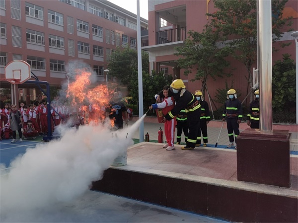 随后,社区消防队来到现场为同学们详细介绍和演示了灭火器的使用方式,还向同学们展示了消防车的装备,这一堂生动的消防安全教育课,不但强化了师生们的消防安全意识,还提高了师生的应变能力。