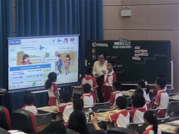 首先,由中山市实验小学教育集团大丰小学王敏霞老师执教三年级Unit 3 Look at me!第一课时A Let's talk & Let's do部分。王老师丰富的肢体语言及抑扬顿挫的语调充分吸引了学生的注意力、调动了他们的积极性,借助图片、音频、视频等多种形式引导学生深入理解关键句型。王老师还拓展了有关绘本,拓宽学生的知识面,引导学生学会表达自己的感受,升华了学会爱自己、爱他人,用语言表达爱的主题。