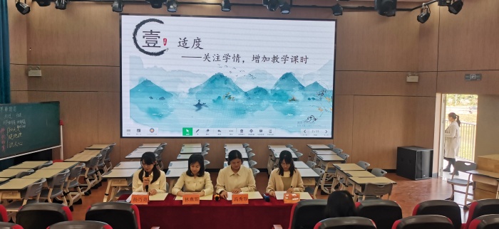 最后环节——主题鲜明评议课。这个环节由冯秀珍、林燕妮、吴倩莹和杨巧苑四位老师组成的评课组围绕“中国古典名著单元教学中‘度’的把握”进行评课议课。评课团队从“适度”“梯度”“效度”“深度”四个方面指出《草船借箭》的教学做到了为古典名著阅读搭建强有力的支架,使得有难度的阅读变得更加流畅,也激发学生整本书阅读的兴趣;而对比式阅读则把相同的情节片段,汇聚一起,在课堂上落实“1+X”阅读,拓宽学生的阅读面。
