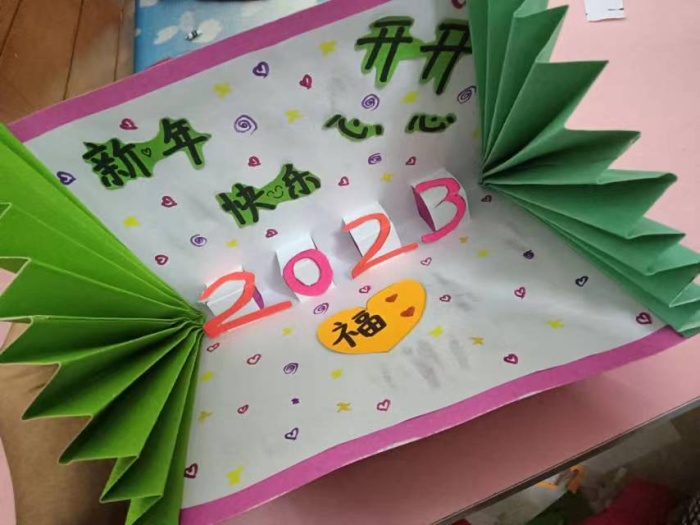 同学们用画笔描绘心中的祝愿,用颜色构筑心中的向往。一张张精美的贺卡,一句句真诚的祝福,展示出了孩子们眼中的新年,流露出新年的气息。